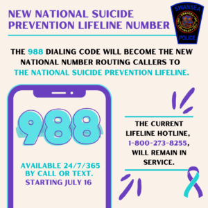 New Three-Digit Phone Number 988 to Take Effect July 16 SWANSEA — Chief Marc Haslam and the Swansea Police Department wish to share information regarding the…