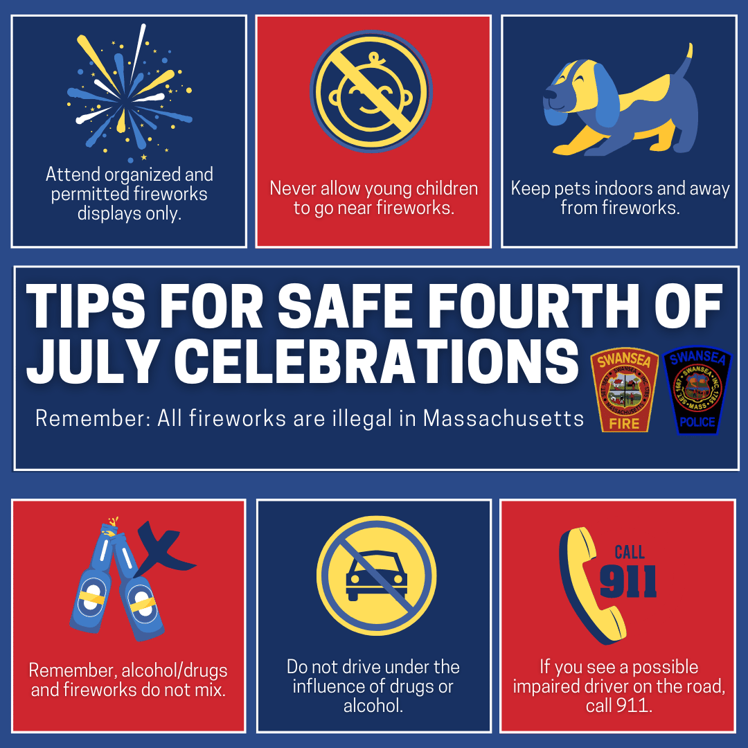Swansea Police Chief Marc Haslam and Fire Chief Eric Hajder wish to share several important safety tips and reminders as residents prepare to celebrate the Fourth of July holiday.