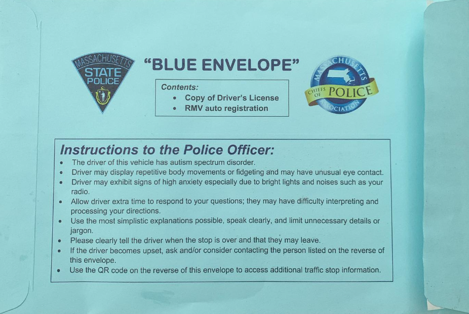 The program provides individuals with a blue envelope that they can keep in their vehicles in the event of a traffic stop or interaction with law enforcement. The specially designed envelope holds a driver’s essential documents — license, registration and a contact card — and is recognizable by trained law enforcement. Instructions for both the driver and the officer conducting the motor vehicle stop are printed on the envelope to reinforce calm, positive interactions between drivers with autism and police officers.