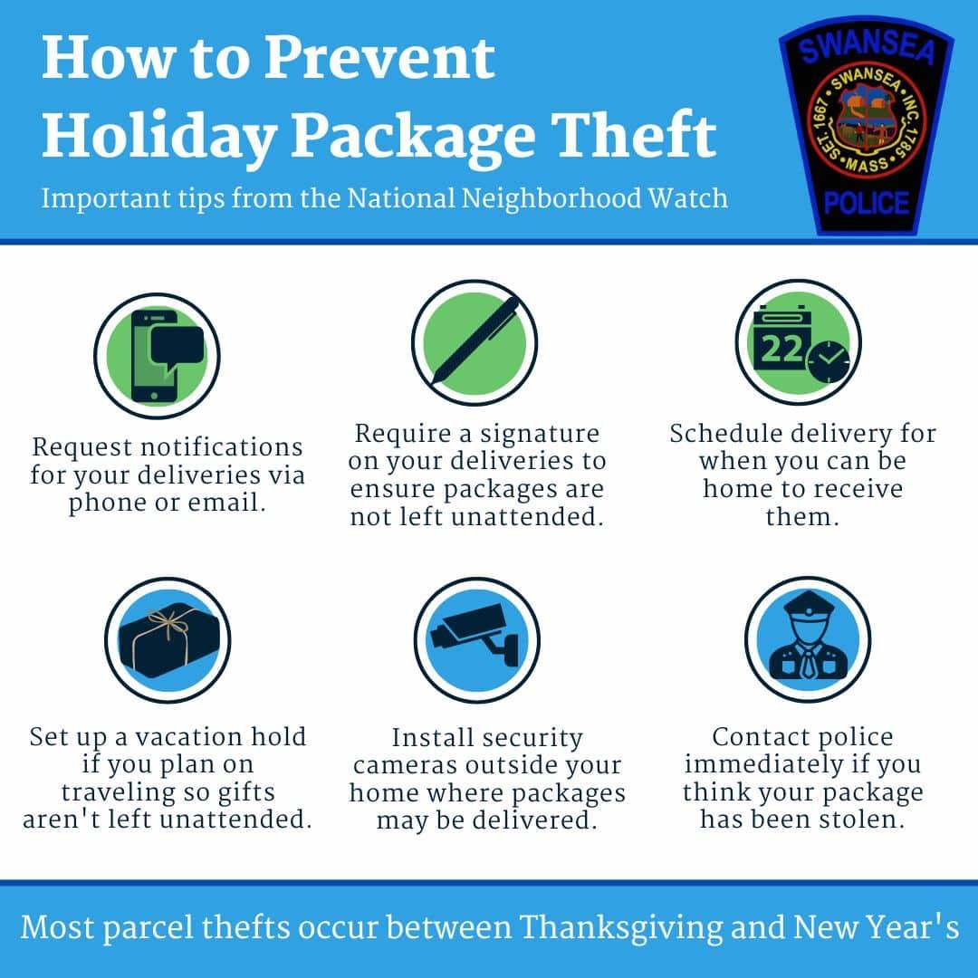 SWANSEA — As the holiday season approaches, Chief Marc Haslam and the Swansea Police Department would like to provide tips to prevent theft for residents expecting package deliveries within the coming weeks.