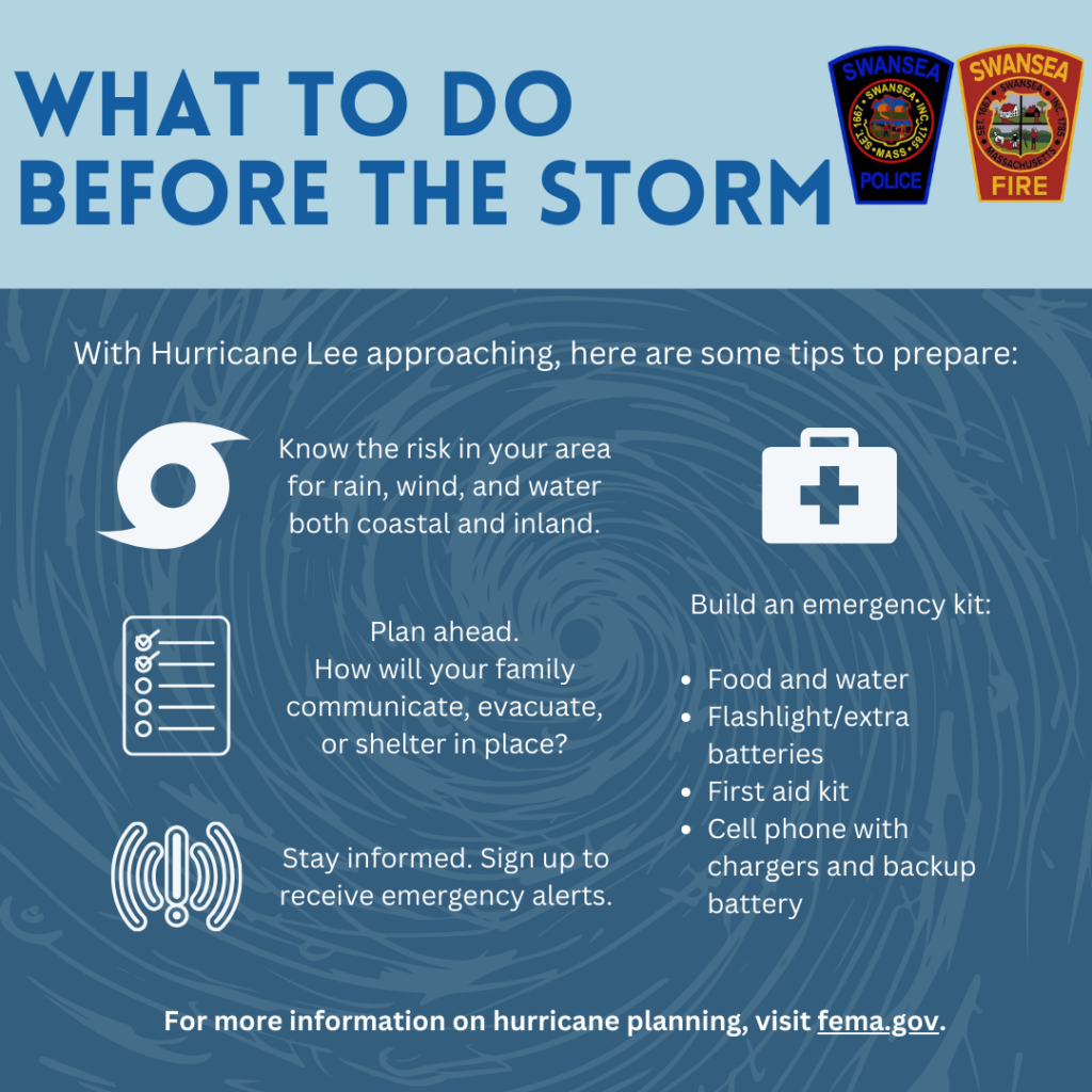 The Town of Swansea, Police Chief Marc Haslam and Fire Chief Eric Hajder are asking residents to remain alert and take the necessary precautions as Hurricane Lee is tracking toward New England in the coming days.